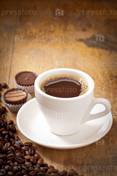 Чашка кофе и шоколадные конфеты на старом деревянном столе
