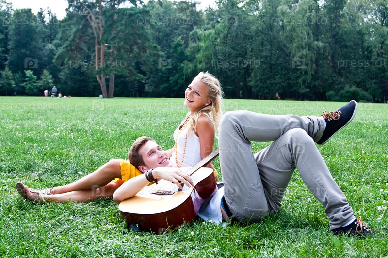 Молодой мужчина играет на гитаре в парке красивой женщине