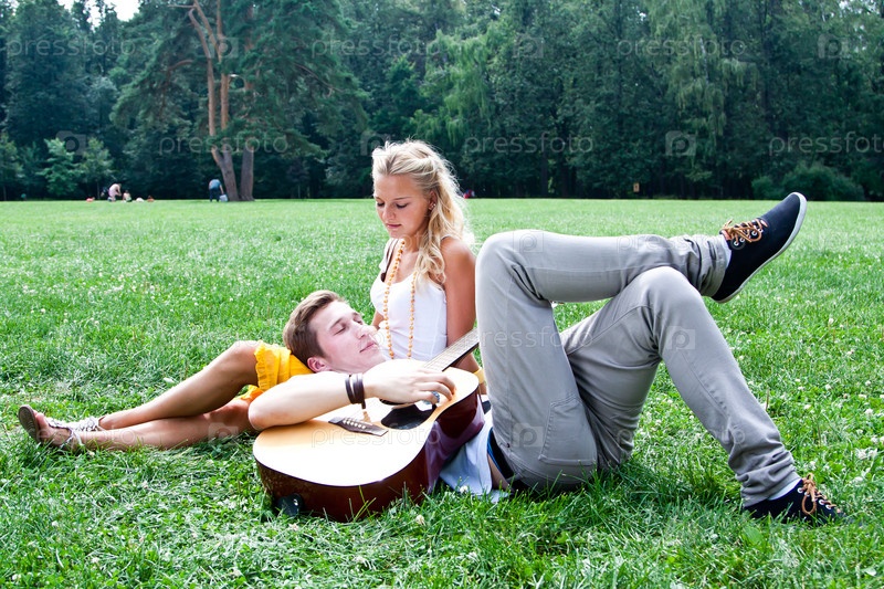 Молодой мужчина играет на гитаре в парке красивой женщине