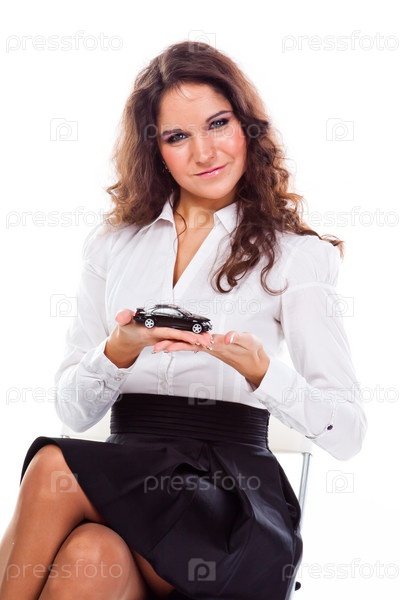 Молодая и красивая женщина с игрушечной машиной в руках