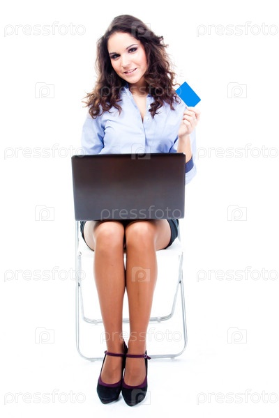 Молодая и красивая женщина делает покупки в интернете по кредитной карте