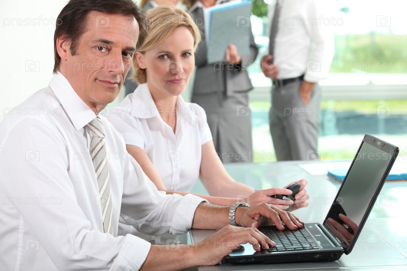 Бизнесмен и бизнес-леди с ноутбуком