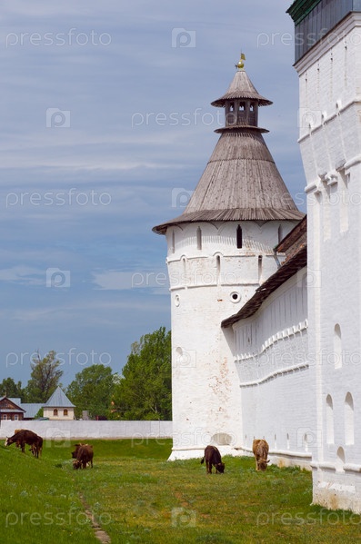 Вид на стену старого монастыря и коров, пасущихся рядом