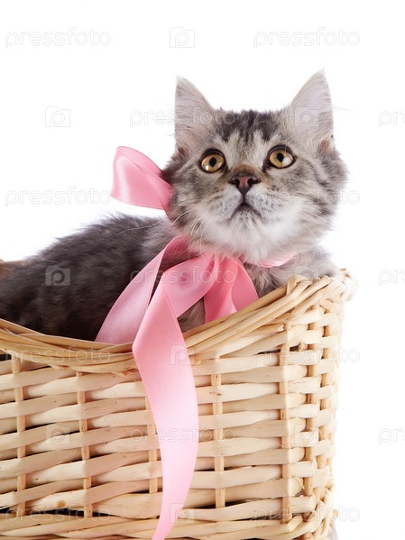 Кошка с бантом в плетеной корзине
