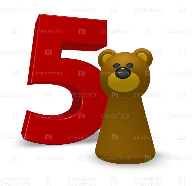 Число 5 и коричневый медведь - 3D иллюстрация