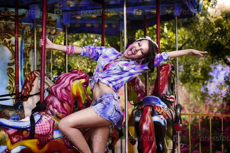 Радость. Жизнерадостная женщина в парке развлечений на карусели