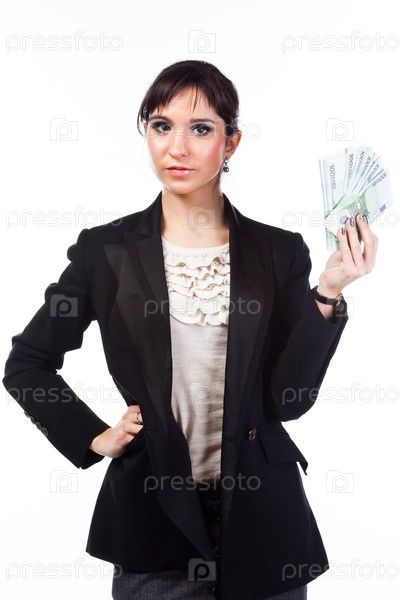 Молодая, красивая и счастливая женщина с пачкой денег