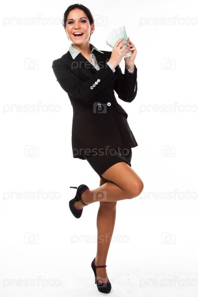 Молодая, красивая и счастливая женщина с пачкой денег