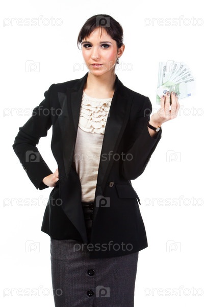 Молодая, красивая и счастливая женщина с пачкой денег