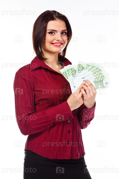 Молодая, красивая и счастливая женщина с пачкой денег