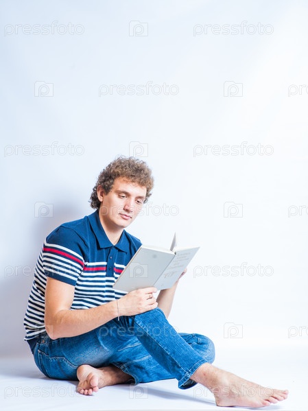 Портрет молодого мужчины с открытой книгой в студии на сером фоне