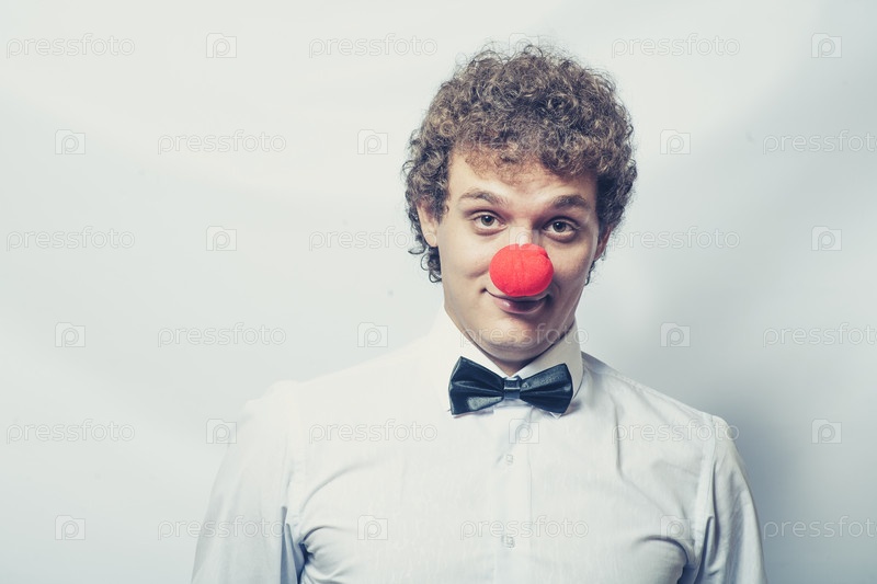 Молодой студент или бизнесмен с красным клоунским носом. Голова и плечи