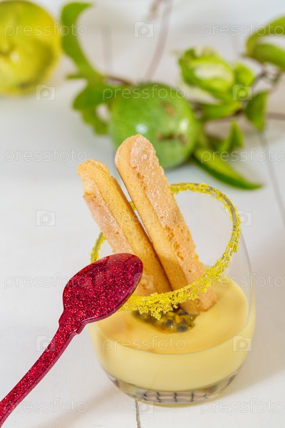 Фруктовый десерт с красной ложкой в стакане