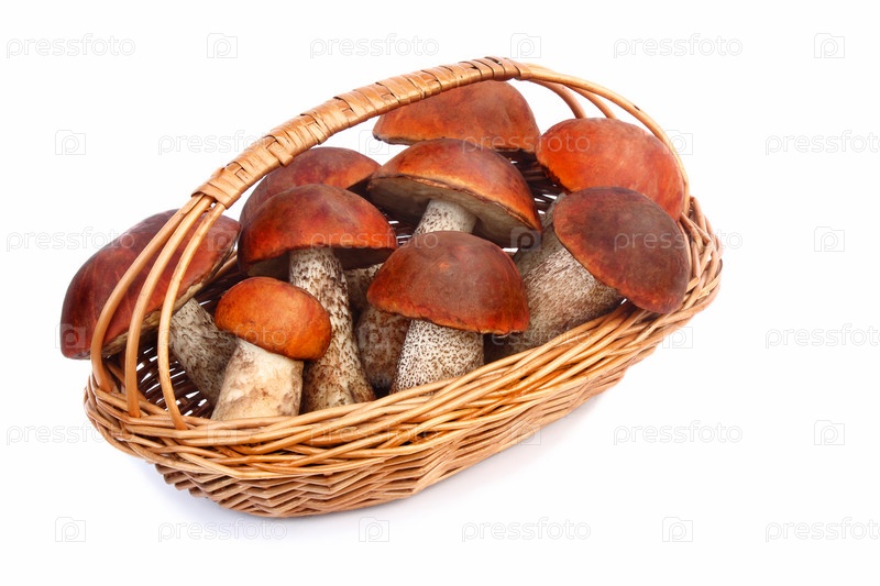 Грибы в плетеной корзине на белом фоне