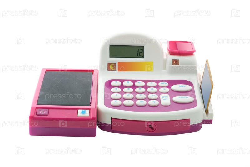 Игрушечный кассовый аппарат крупным планом. Изоляция на белом фоне