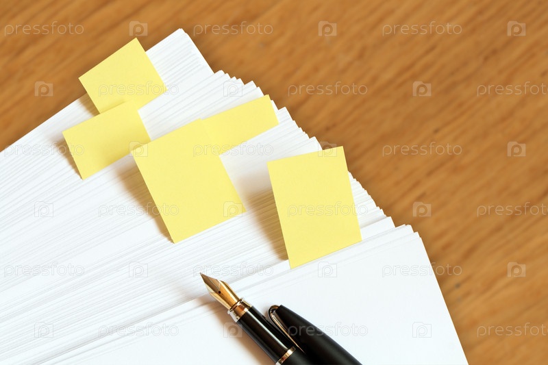 Перьевая ручка на стопке бумаг со стикерами