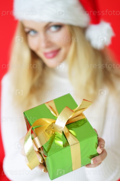 Блондинка в новогоднем колпаке и подарком на красном фоне