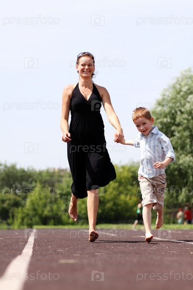 Мать и сын бегут по дорожке на открытом воздухе