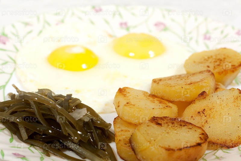 Яичница, морская капуста и картофель на тарелке