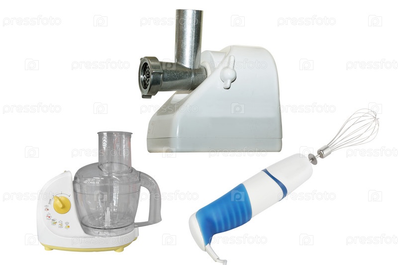 Мясорубка, кухонный комбайн и блендер на белом фоне