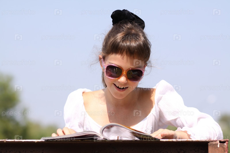 Девочка в солнечных очках читает журнал