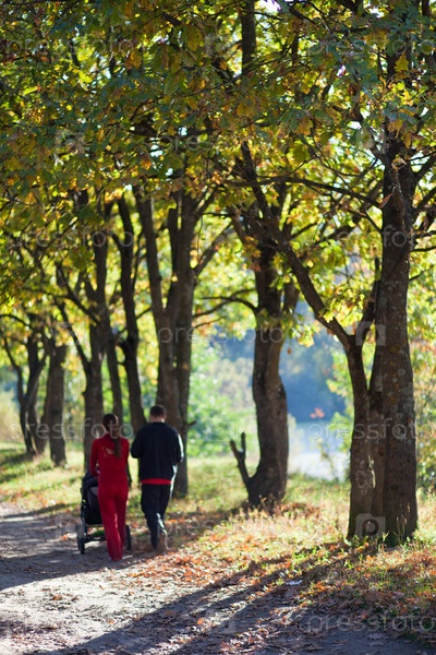 Семейная пара с коляской гуляет по парку