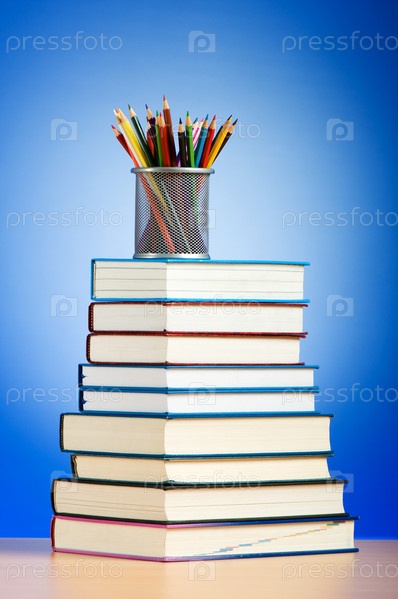 Множество разноцветных карандашей в железном стаканчике на стопке книг