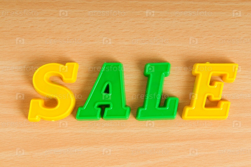 Слово 'sale', выложенное пластиковыми буквами на столе
