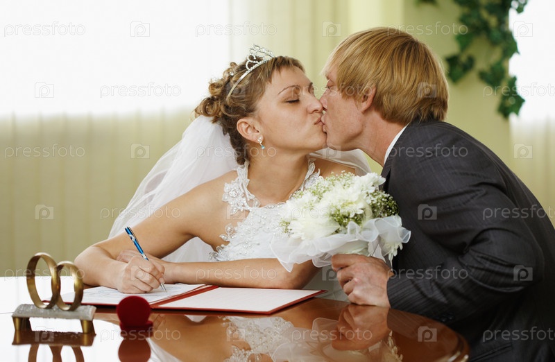 Поцелуй счастливых молодоженов в загсе