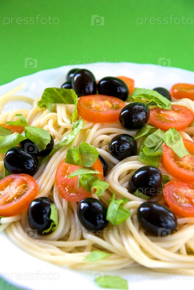Тарелка спагетти с помидорами черри, маслинами и салатом