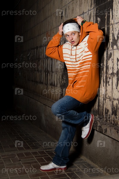 Парень, одетый в стиле хип-хоп, на улице ночью