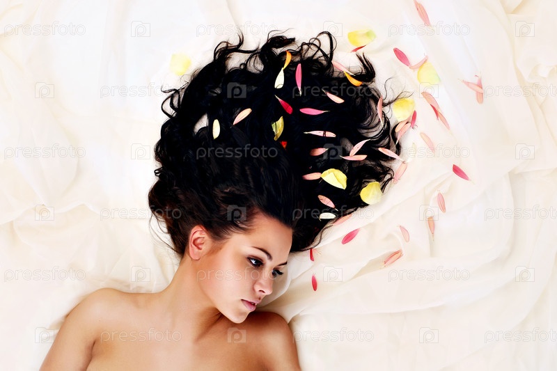 Портрет молодых красивых брюнет с длинными темными волосами в лепестках цветов