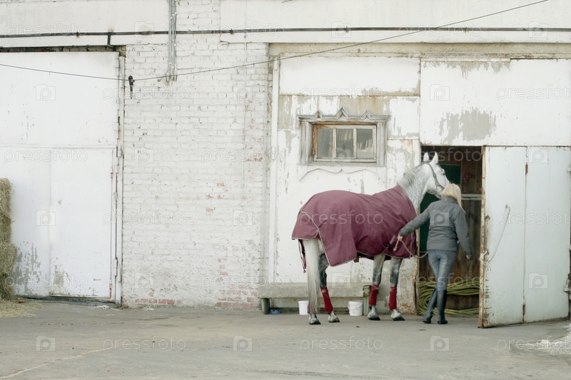 Лошадь и наездница возле конюшни