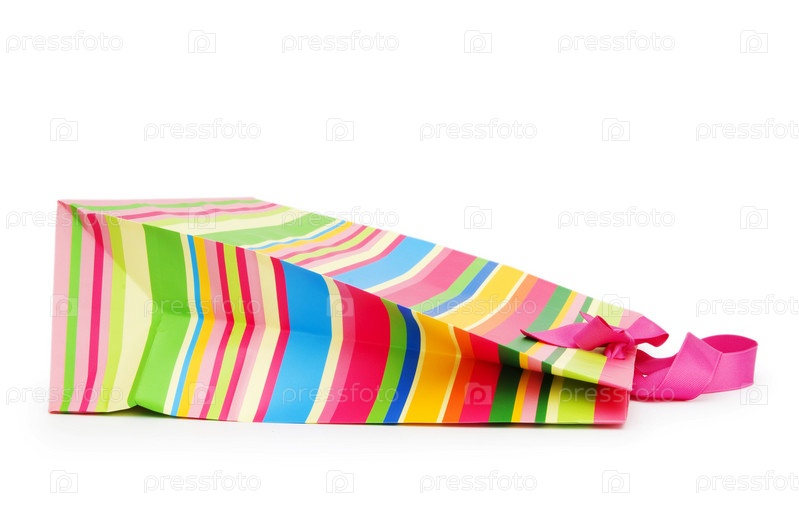 Полосатый подарочный пакет, изолированный на белом фоне