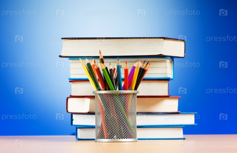 Стопка книг и цветные карандаши в подставке на голубом фоне