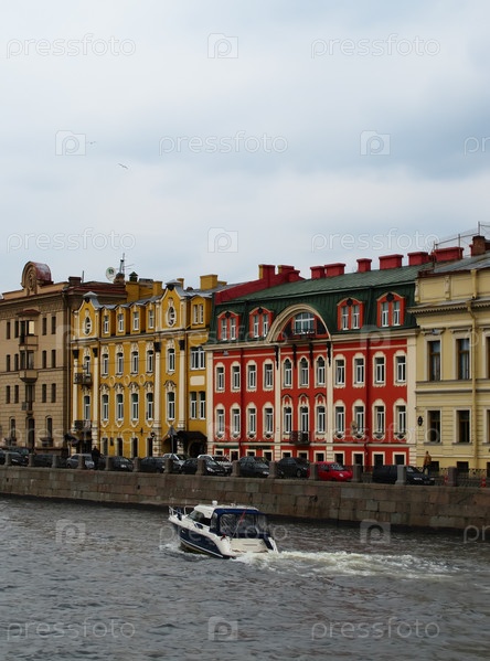 Водный катер на фоне городской улицы