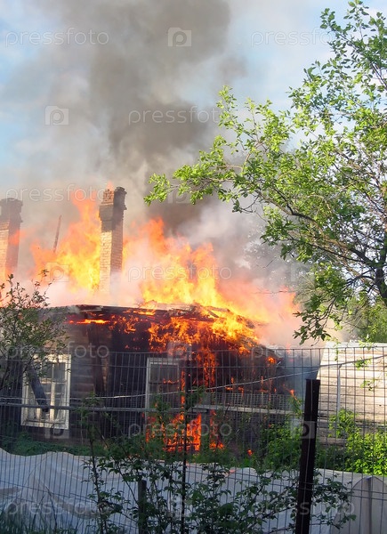 Горит деревянный дом