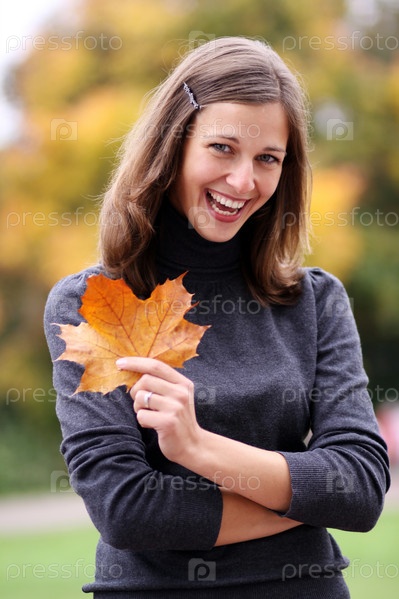 Девушка с осенними листком на открытом воздухе
