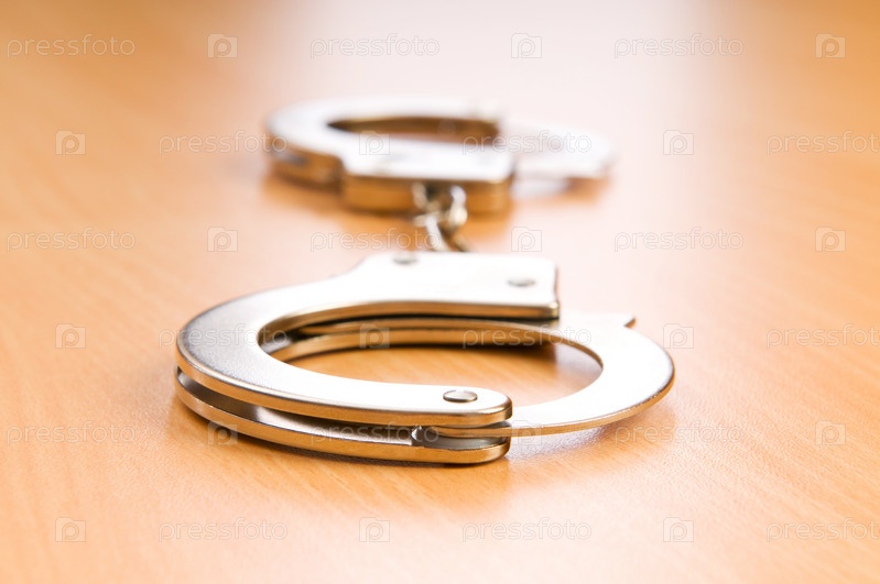 Металлические наручники на деревянном фоне