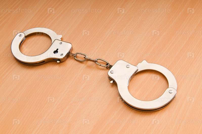 Металлические наручники на деревянном фоне