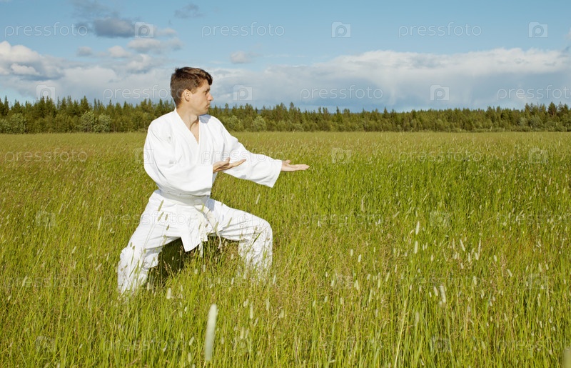 Каратист в белом кимоно тренируется посреди поля