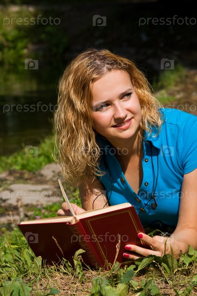 Девушка с книжкой лежит на траве в парке