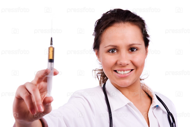Женщина-врач в халате со шприцем на белом фоне
