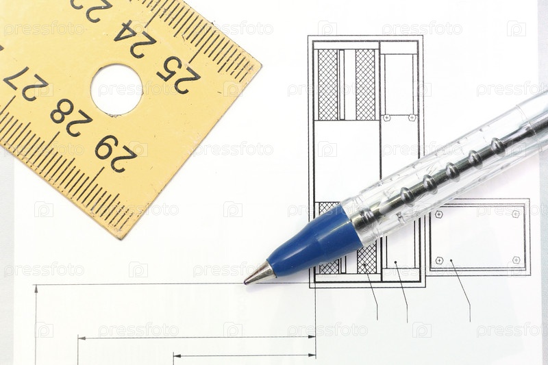 Ручка с линейкой, лежащие на чертеже