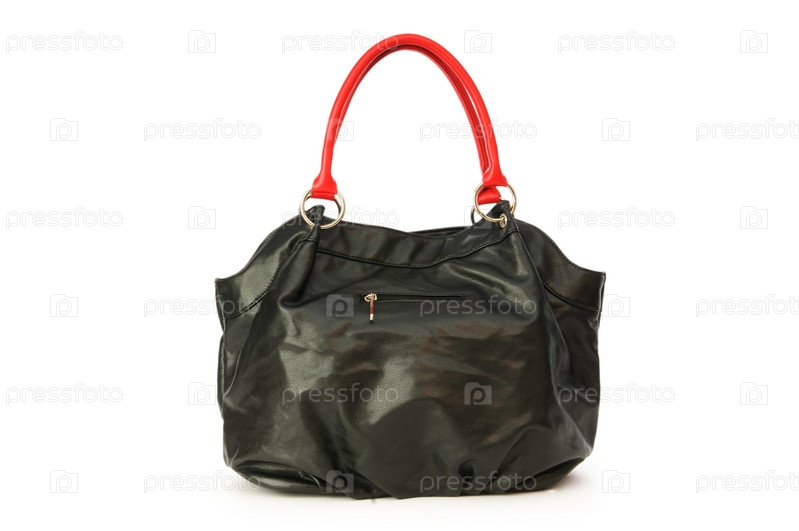 Кожаная женская сумка с красной ручкой на белом фоне
