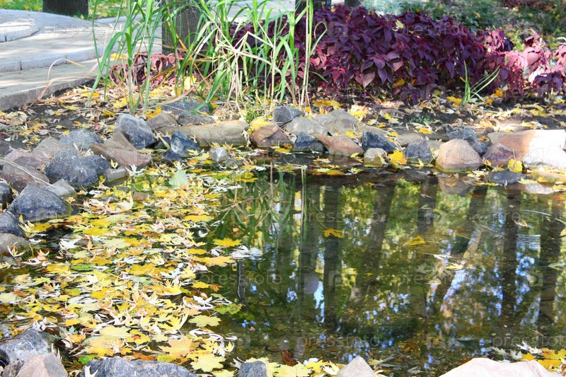 Небольшой пруд с упавшими листьями, огороженный камнем