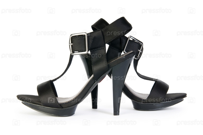 Пара черных женских туфель на белом фоне