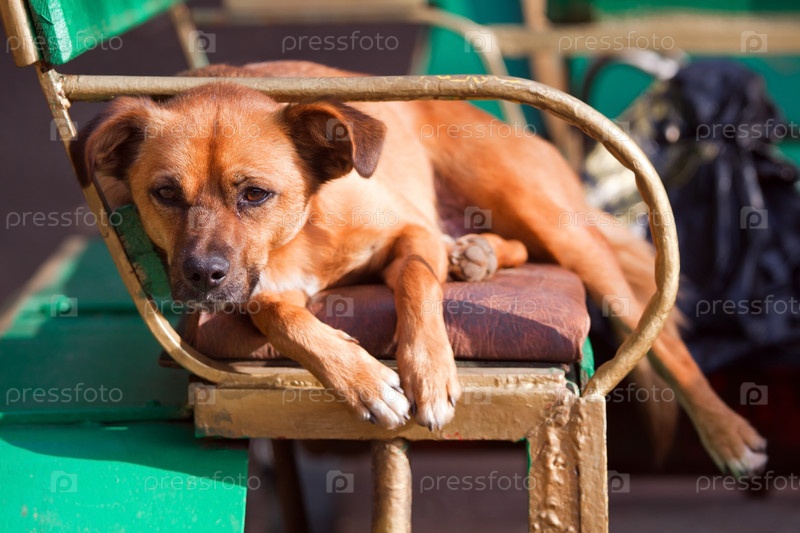 Собака лежит на скамье