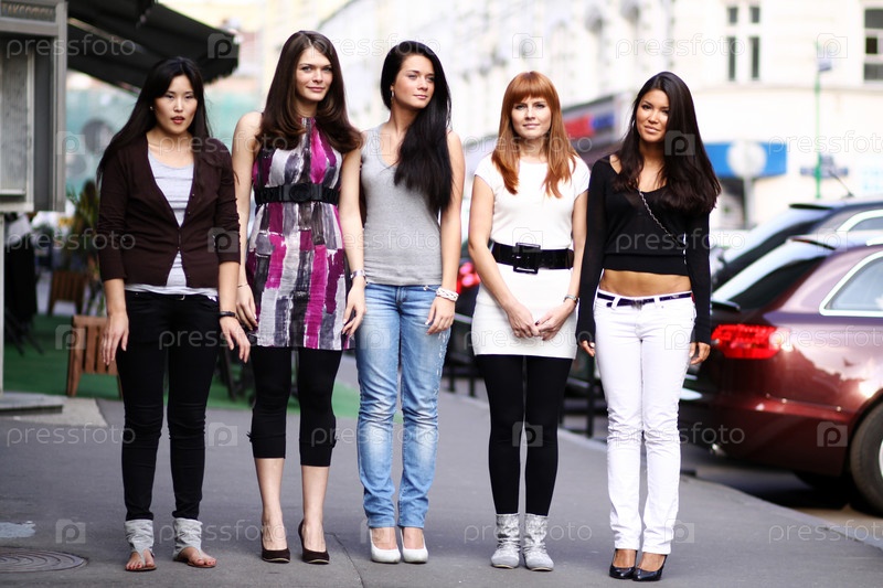Пять девушек стоят на городской улице