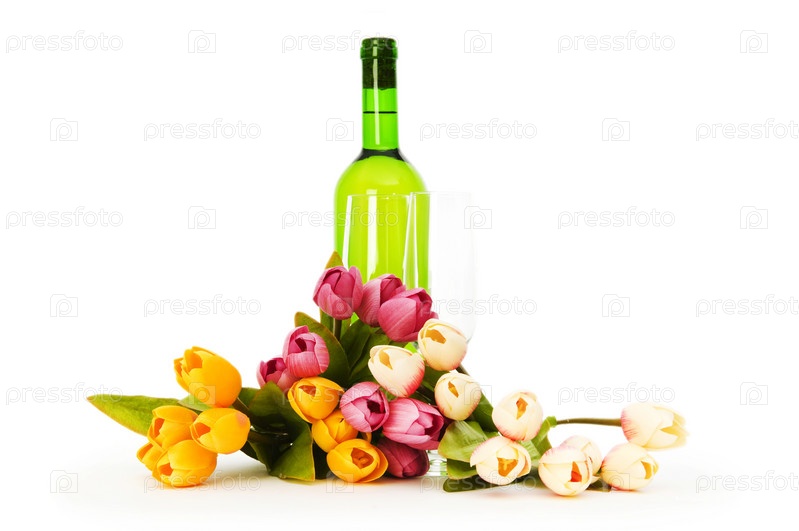 Бутылка вина в разноцветных тюльпанах на белом фоне